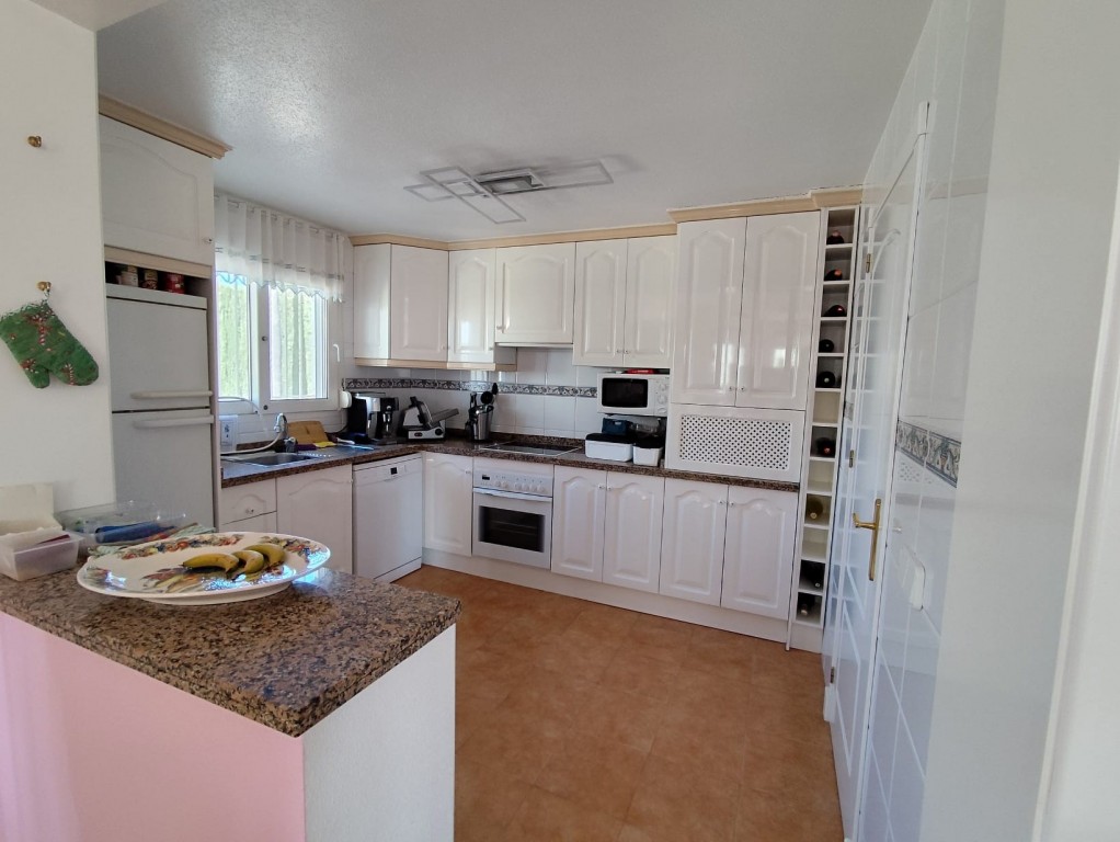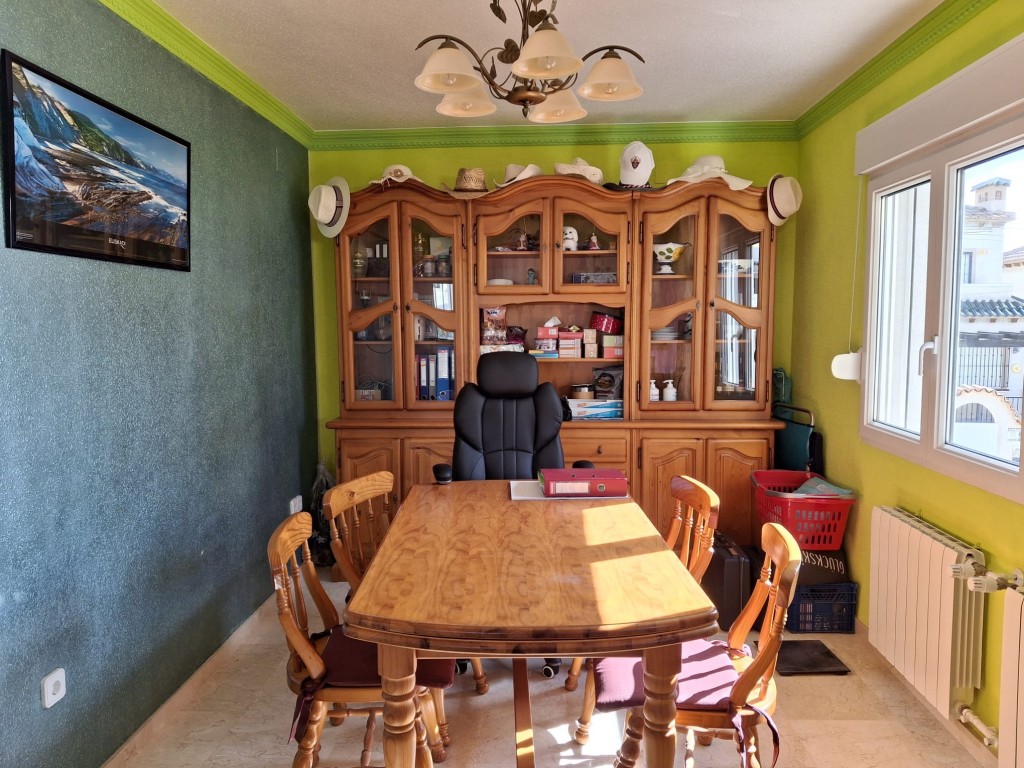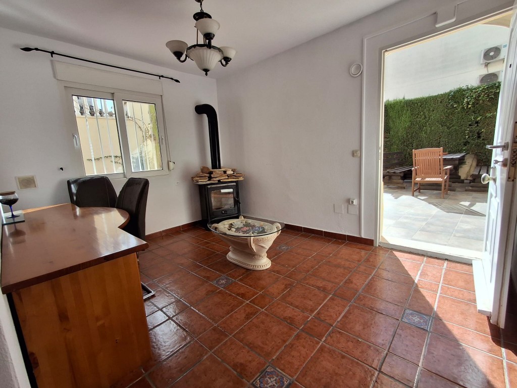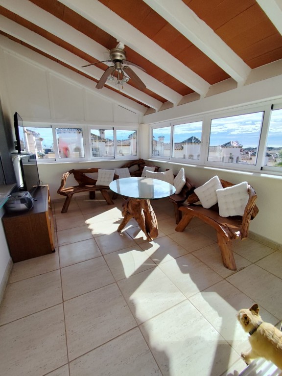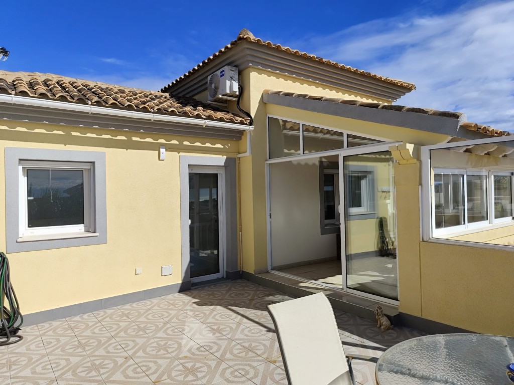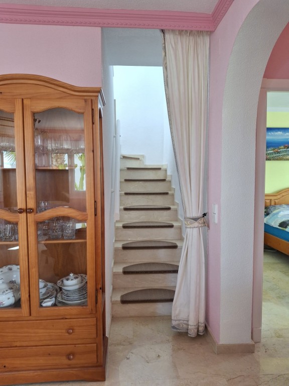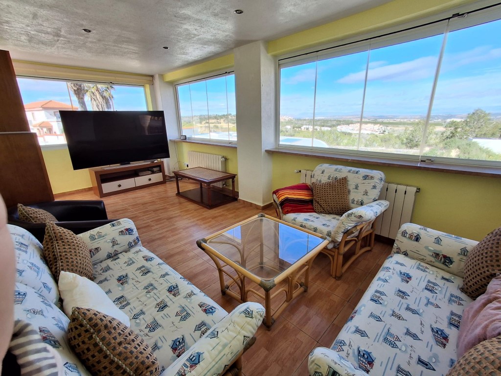 Im Obergeschoss befindet sich das großzügige Hauptschlafzimmer mit eigenem Badezimmer und Zugang zu einer privaten Terrasse mit schönem Ausblick. Ein verglaster Wintergarten bietet zusätzlichen Wohnraum und kann das ganze Jahr über genutzt werden. Ein weiterer verglaster Bereich mit Blick auf die Berge von San Miguel de Salinas eignet sich ideal als Büro, Lesezimmer oder zusätzliches Schlafzimmer.