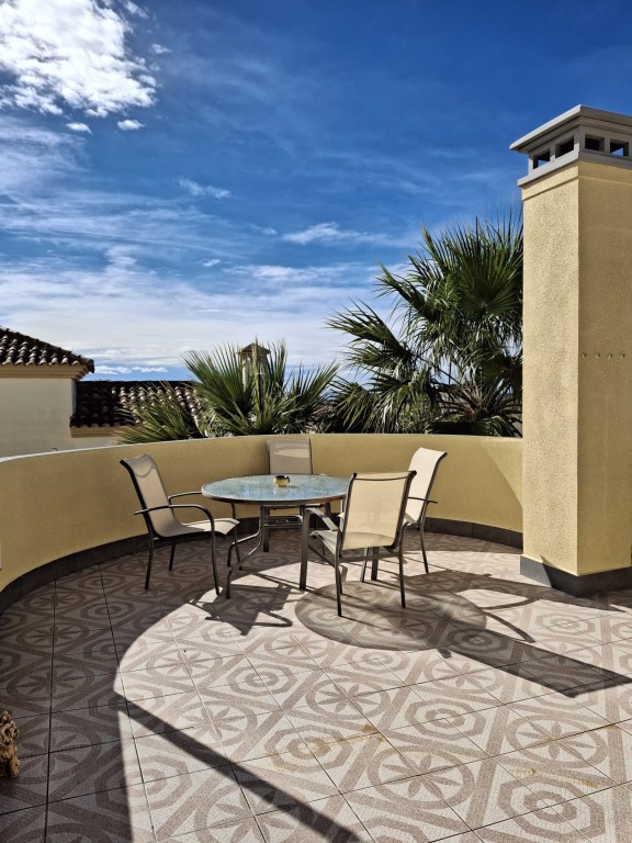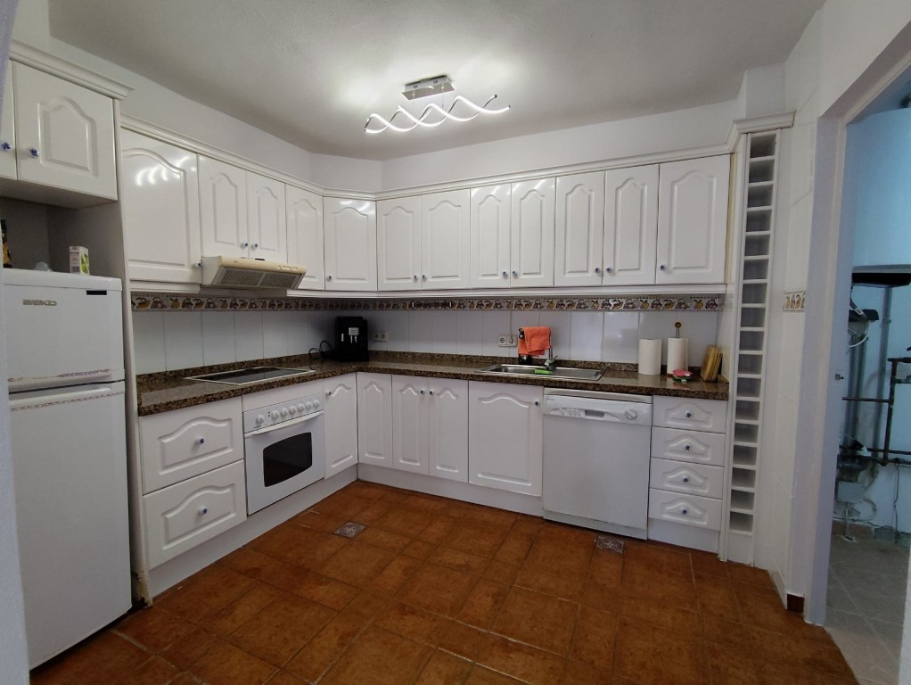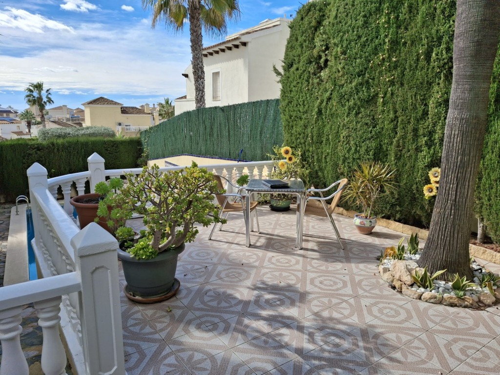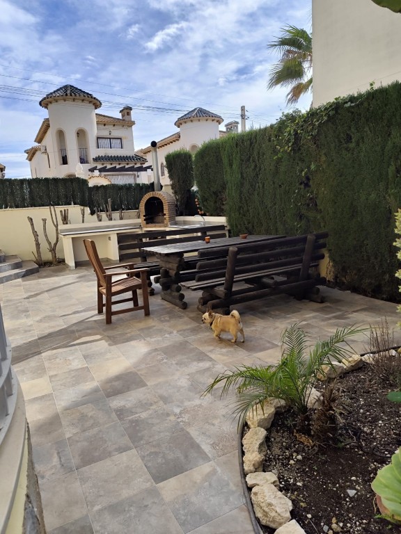 Der Außenbereich ist pflegeleicht gestaltet und bietet mehrere Terrassenbereiche, eine überdachte Sitzecke sowie eine Außenküche mit Grill – perfekt, um die warmen Tage an der Costa Blanca entspannt im Freien zu genießen.