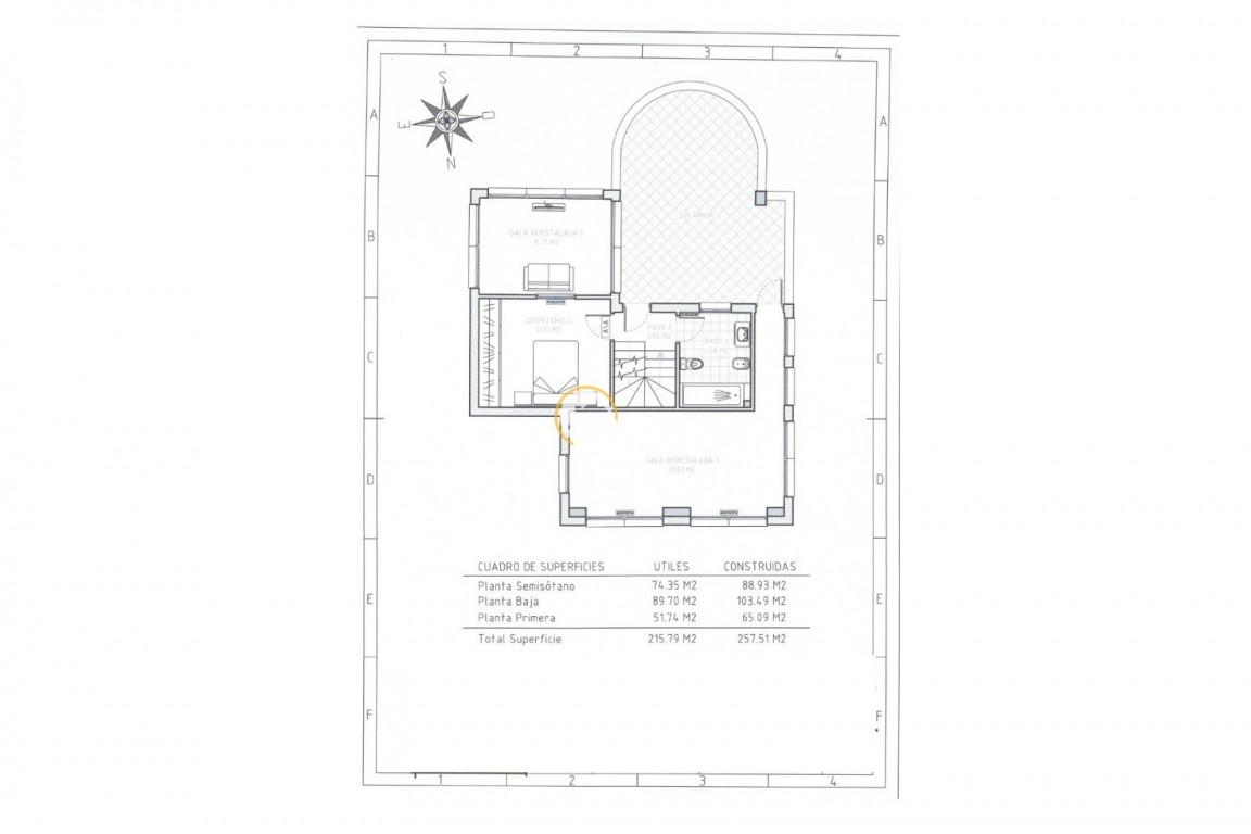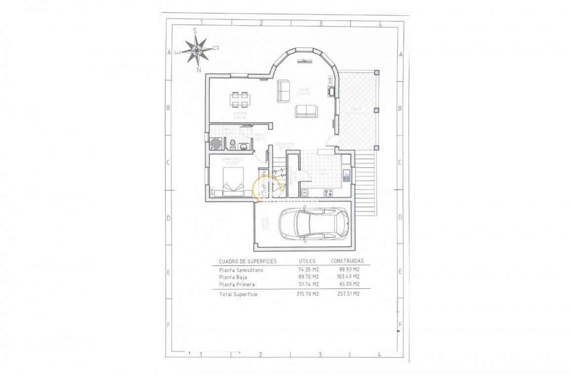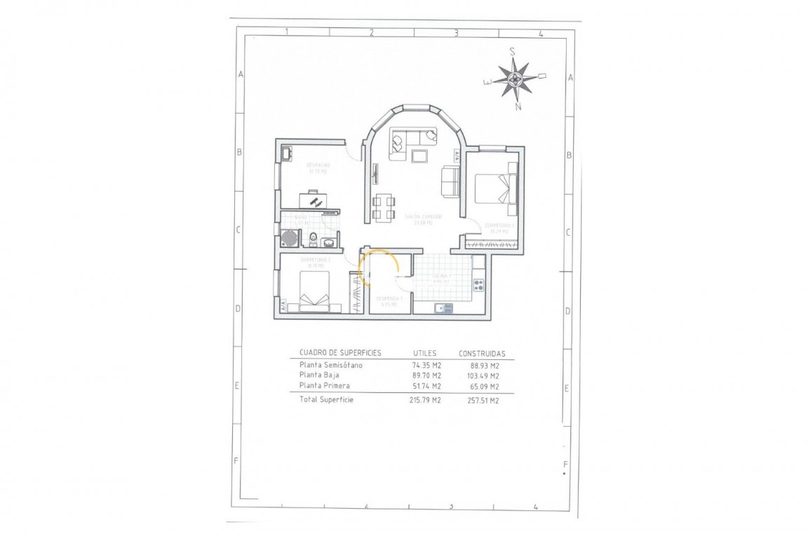 Die Gesamtwohnfläche beträgt ca. 257 m² und verteilt sich auf Untergeschoss, Hauptebene und Obergeschoss.